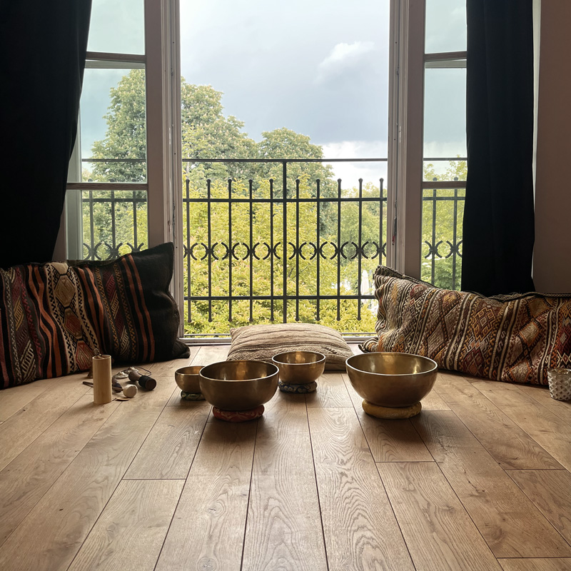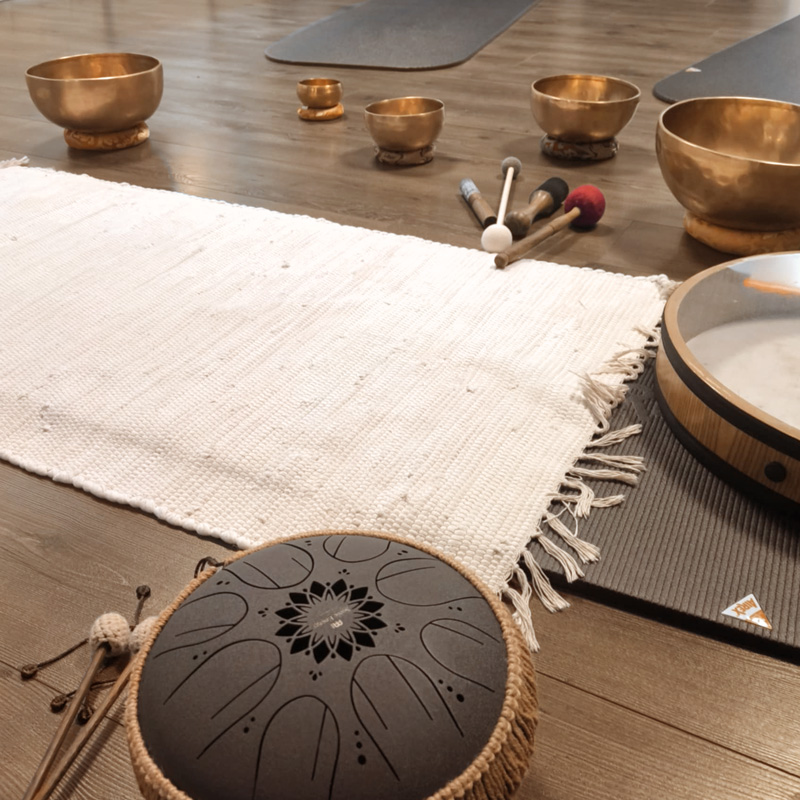 Kis létszámú hangtér, ahol nem a tematika vezet – hanem a jelenlét. A hangtálak és egyéb hangszerek rezgései közös teret nyitnak, miközben minden résztvevő a saját ritmusában hangolódik. A test és az idegrendszer megpihenhet, a figyelem finoman befelé fordul. Elengedés, megérkezés, kapcsolódás – másokkal együtt.